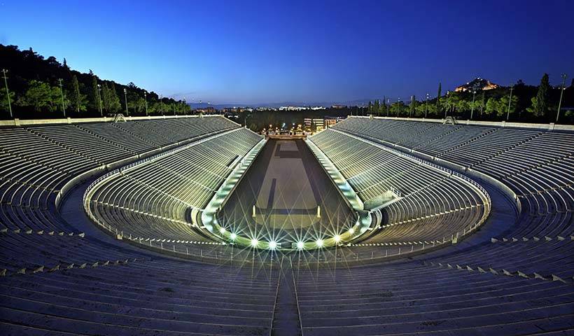 Le Stade Panathénaïque emblématique est entièrement construit dans le meilleur marbre grec (d'où son nom) et est associé aux Jeux Olympiques modernes et à l'Esprit Olympique. Le stade est situé dans le quartier central d'Athènes, Pangrati, à l'est des Jardins nationaux et de la salle d'exposition Zappeion, à l'ouest du quartier résidentiel de Pangrati, et entre les collines jumelles couvertes de pins d'Ardettos et d'Agra.