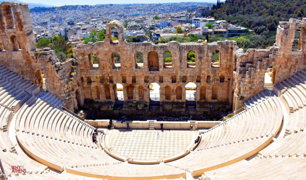 L'Odeon d'Hérode Atticus est une structure en pierre du théâtre romain située sur le versant sud-ouest de l'Acropole d'Athènes, en Grèce. Le bâtiment a été achevé en l'an 161 et ensuite rénové en 1950.